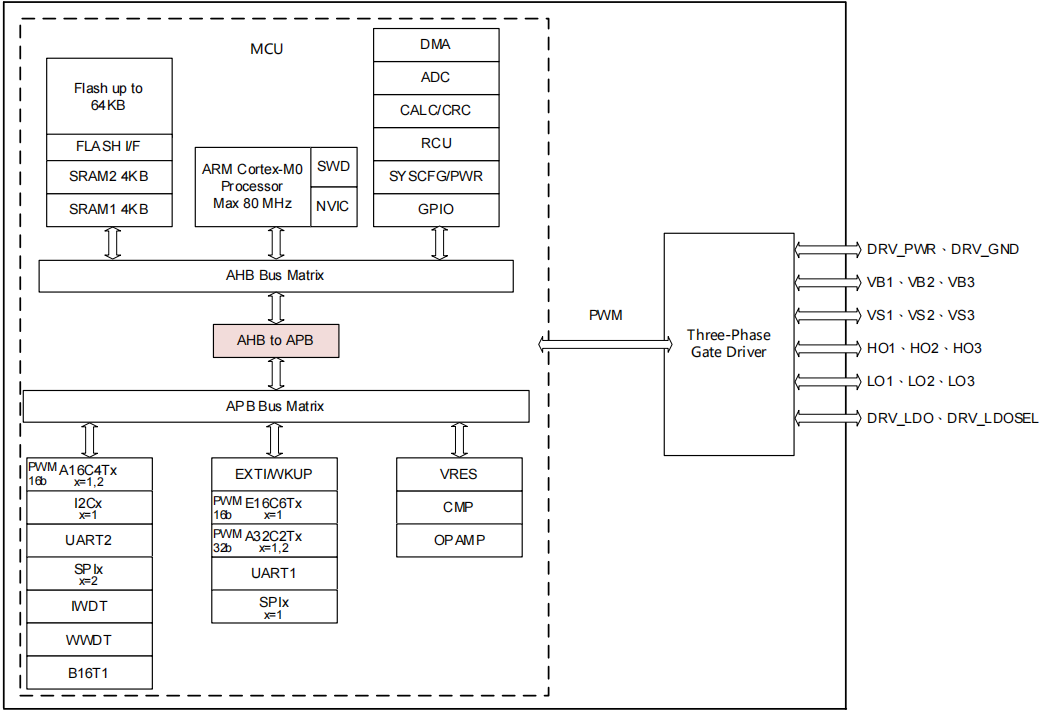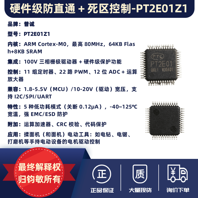 | PT2E01Z1 is an MCU for motor applications, integrating a high-performance 32-bit ARM Cortex-M0 core and a 100V-voltage-tolerant three-phase gate driver. The chip operates at a maximum frequency of 80MHz, with up to 64KBytes of Flash and 8KBytes of SRAM. It offers a rich set of practical functional modules and standard-compliant communication interfaces, including 1 I2C, 2 SPIs, and 2 UARTs. A variety of timer resources are supported, consisting of 1 16-bit enhanced timer (E16C6T), 2 32-bit advanced timers (A32C2T), 2 16-bit advanced timers (A16C4T), and 1 16-bit basic timer (B16T). PT2E01Z1 is equipped with universal analog resources, including a 12-bit high-speed ADC, an analog comparator (CMP), a VRES (32-step resistor divider), and an operational amplifier (OPAMP). The OPAMP supports configurable differential/single-ended PGA with gain ranges from x1 to x32. Additionally, it features an arithmetic acceleration unit (CALC) for division/square root operations and a CRC module that supports configurable generator polynomials. The operating voltage of PT2E01Z1 is divided into 1.8 ~ 5.5V for the microcontroller (VDDH and VDDA) and 10 ~ 20V for the three-phase gate power supply (VDRV_PWR). It operates within a temperature range of -40 ~ 105°C and supports multiple low-power modes. PT2E01Z1 is a versatile motor application controller specifically designed for various vehicle control applications and power tools. Its use cases cover functions such as sequential turn signals, in-vehicle ambient lighting, air conditioning airflow adjustment, power seat control, and power tool operation. |