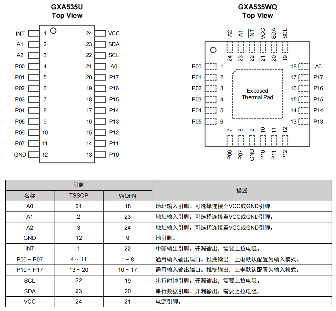 ![]() | Introduction to GXA535GXA535 is mainly used for expanding general-purpose input/output (GPIO) ports. Port data is transmitted via the standard two-wire I²C protocol, supporting a maximum communication rate of 1MHz (up to 2MHz when the high-speed mode is enabled). GXA535 features 16 push-pull GPIO ports, all of which can directly drive LED components. Each bit of the GPIO ports can be independently configured as input or output mode, with the default mode being input upon power-on. Package Information: