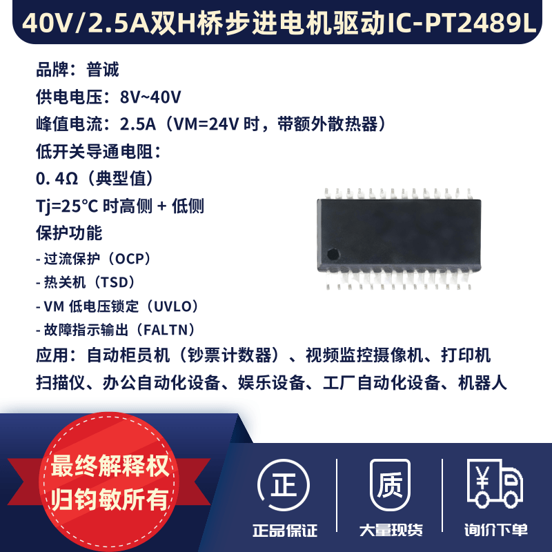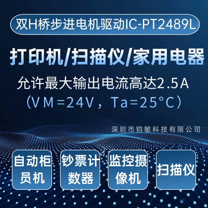 PT2489L is a monolithic integrated motor driver specifically designed for printers, scanners, or household appliances. It adopts a dual-channel H-bridge architecture, which can drive bipolar stepper motors or two brushed DC motors. The H-bridge driver is composed entirely of N-channel MOSFETs, enabling a maximum output current of up to 2.5A (with VM=24V and Ta=25°C). The phase/enable input interface is a common configuration for motor drivers; it features high flexibility and can control H-bridge switching to regulate the current and phase of motor windings. The motor current decay mode is programmable via a three-state input pin. PT2489L is available in a 28-pin HTSSOP package with an exposed thermal pad. |