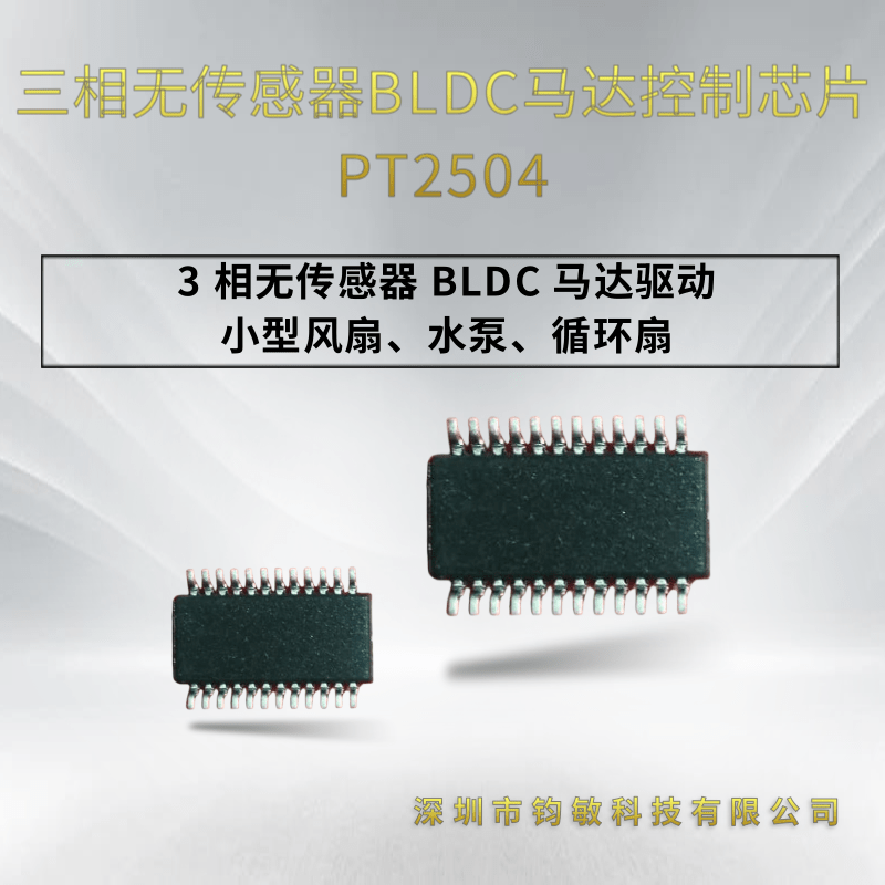 PT2504 is an integrated three-phase sensorless BLDC motor control chip that can directly drive external PNMOS. It is equipped with advanced protection functions, including a soft-start circuit, lock-rotor protection and output current limiting. PT2504 adopts sine wave current control to reduce electromagnetic noise during operation, making it suitable for high-efficiency fan motor drive applications. In terms of speed control, PT2504 supports open-loop control; besides open-loop control, it can also achieve closed-loop control through parameter configuration. Utilizing BCD manufacturing process, PT2504 only requires a single VDD power supply and a minimal number of external components. Packaged in TSSOP24, this chip delivers excellent energy efficiency, making it an ideal solution for compact, cost-effective and sensorless BLDC motor drive systems. |