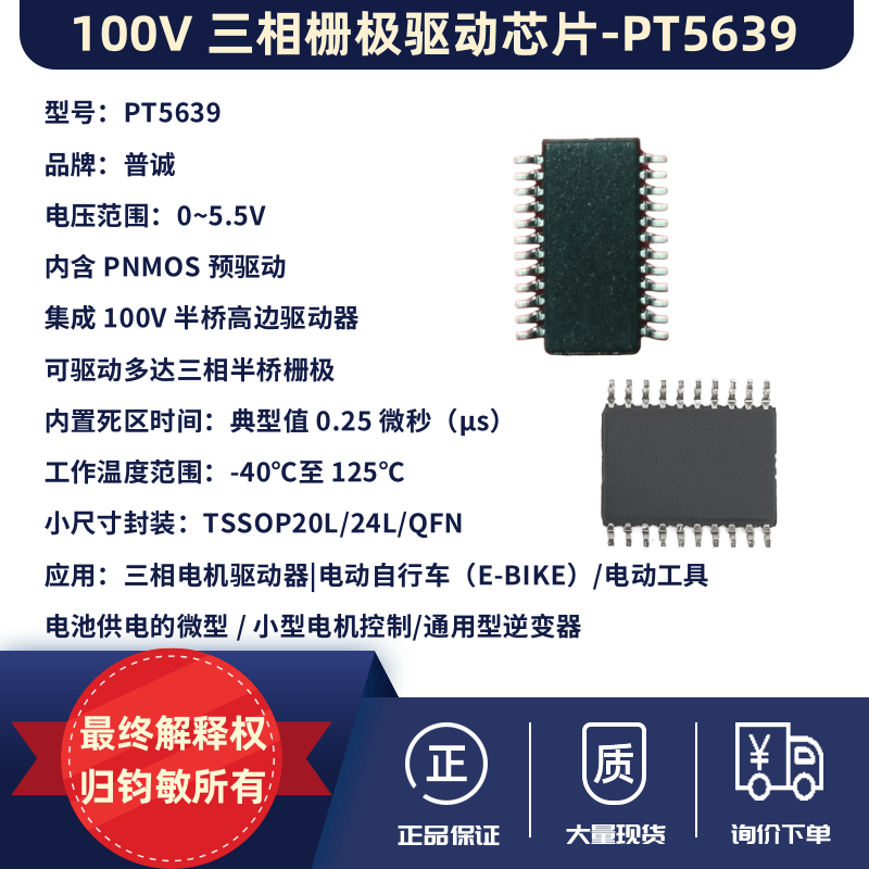 PT5639Block Diagram: | Applications of PT5639: 3-phase Motor Driver for E-BIKE, electric power tool Mini/micro motor control powered by battery General purpose inverter |
