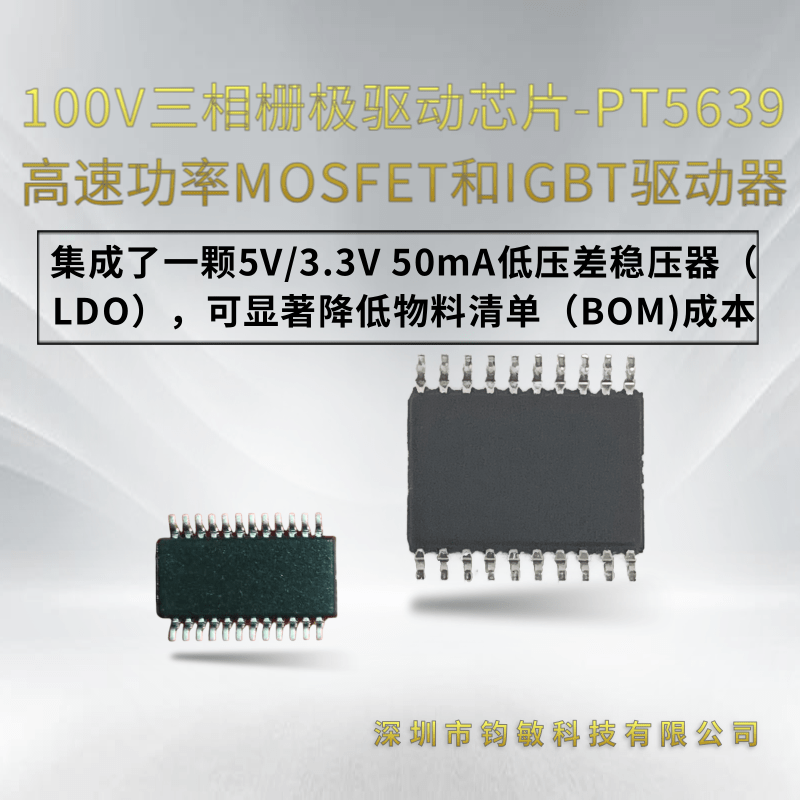 ![]() | Overview of PT5639: The PT5639 is a high speed power MOSFET and IGBT driver with three independent high and low side referenced output channels for 3-phase gate driver. Built-in deadtime protection and Shoot-through protection that prevent half-bridge against damage. The UVLO circuits prevent malfunction when VCC and VBS are lower than the specified threshold voltage. Novel high-voltage BCD process and common-mode noise canceling technique provide stable operation of high-side drivers under high-dv/dt noise circumstances and excellent negative transient voltage tolerance. PT5639 also includes a 5V/3.3V 50mA LDO, which saving the BOM cost. |