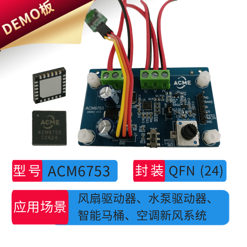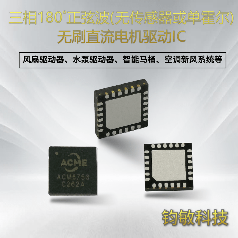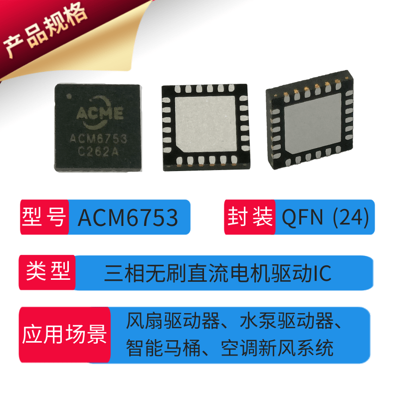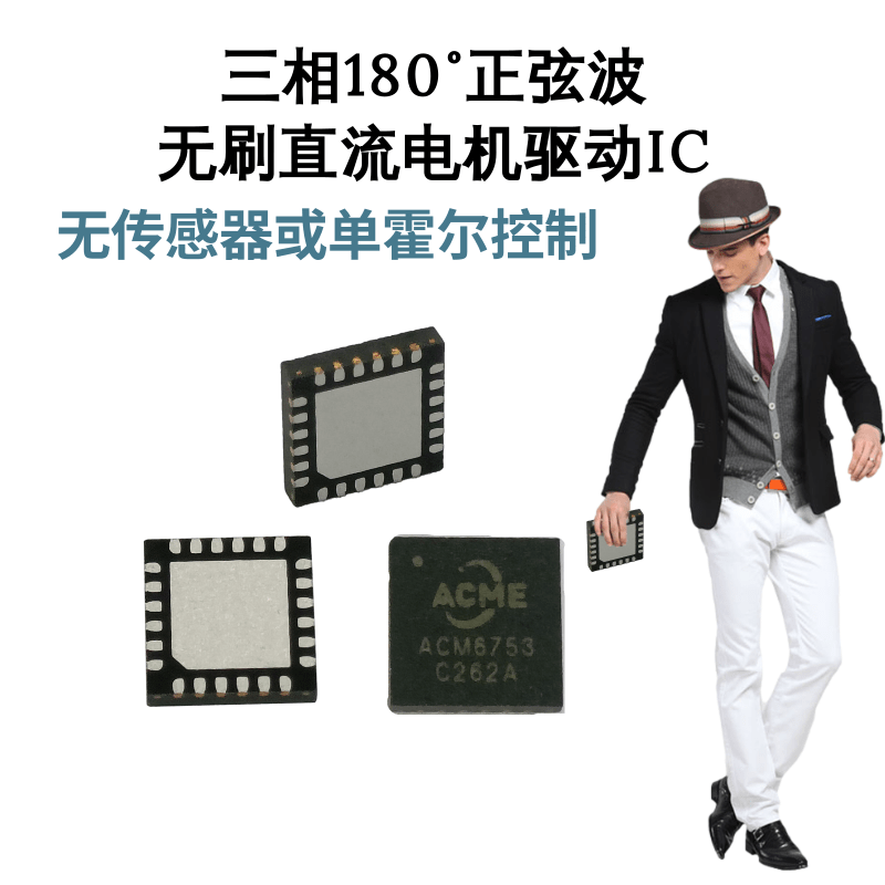 ![]() | Introduction to ACM6753: ACM6753 is a three-phase brushless DC (BLDC) motor driver IC that integrates a sensorless three-phase BLDC motor driving algorithm, phase current detection circuit, gate driver circuit, and power MOSFETs internally. It supports a maximum phase current of 3.2A. With its high integration and simplified peripheral design, the ACM6753 is particularly suitable for three-phase BLDC motor driver applications requiring high power density, small size, and strict low-noise requirements. The ACM6753 supports 180° sinusoidal driving, which effectively avoids electromagnetic noise interference caused by high-order harmonics. It can achieve efficient startup, acceleration, and constant-speed operation based on motor parameters provided by the user. User parameters can be permanently fixed via programming (hardware mode, internal EFUSE programming) or controlled online through I²C (software mode, parameter initialization or online control via I²C registers). The ACM6753 offers multiple speed control methods: external PWM duty cycle speed regulation, external analog voltage speed regulation, I²C register speed regulation, and external PWM frequency speed regulation. To protect both the ACM6753 itself and the external motor, the chip is equipped with a variety of protection mechanisms. |