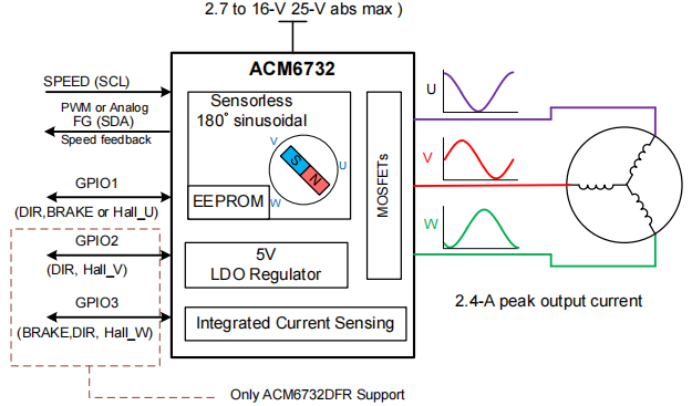 ![]() | ACM6732 Introduction The ACM6732 is a three-phase BLDC motor driver IC. It integrates a built-in sensorless three-phase BLDC motor drive algorithm, phase current detection circuit, gate drive circuit and power MOSFETs, supporting a maximum phase current of 2.4A. Featuring high integration and minimal peripheral components, the ACM6732 is ideally suited for three-phase BLDC driver applications that require high power density, compact size and ultra-low noise performance. The chip supports 180° sinusoidal drive, which effectively eliminates electromagnetic noise interference caused by high-order harmonics. It also provides square-wave drive mode for scenarios requiring fast startup and high torque output. The ACM6732 enables reliable motor startup, acceleration, and constant-speed or constant-voltage operation based on customized motor parameters. User configuration parameters can be permanently stored via one-time programming. Multiple speed control methods are supported, including external PWM duty cycle regulation, analog voltage speed control, and external PWM frequency speed regulation. Rich built-in protection mechanisms are adopted to safeguard both the ACM6732 chip and the external motor against abnormal operating conditions. |