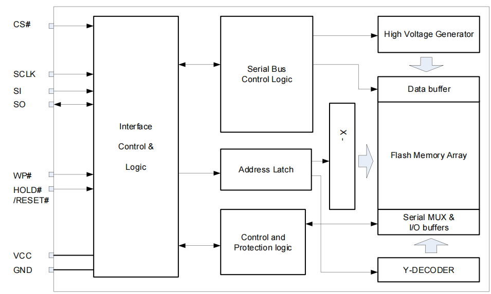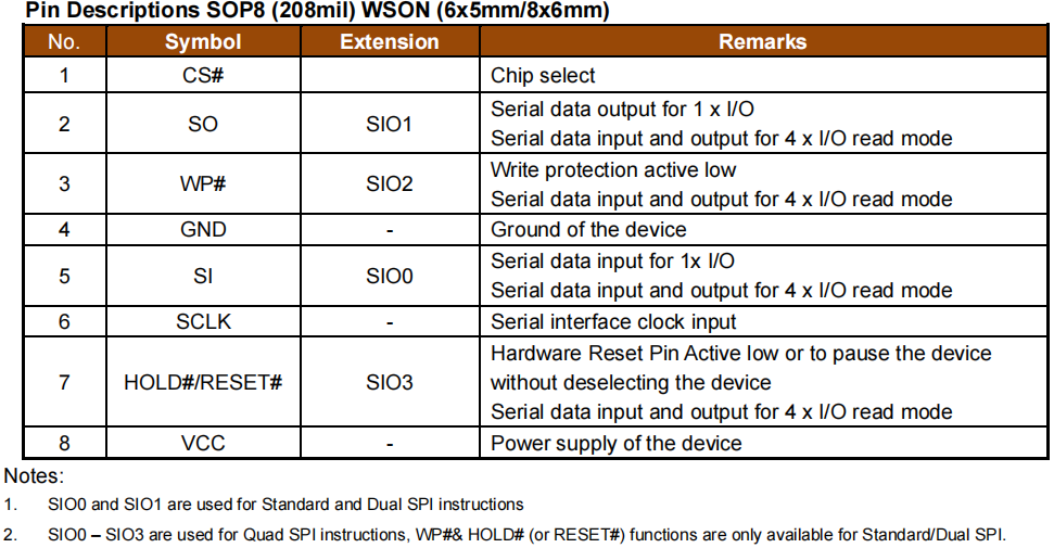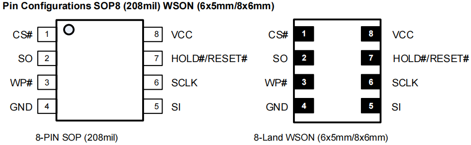-标准SPI:SCLK、CS#、SI、SO、WP#、HOLD#