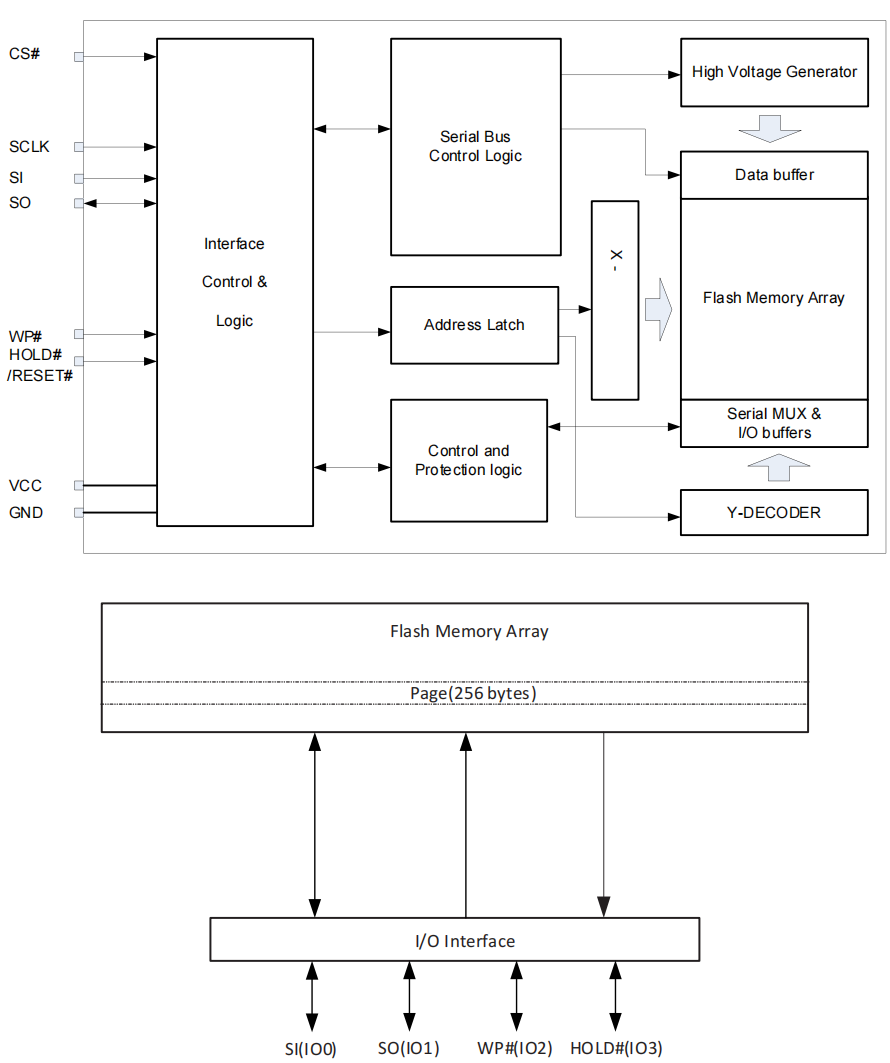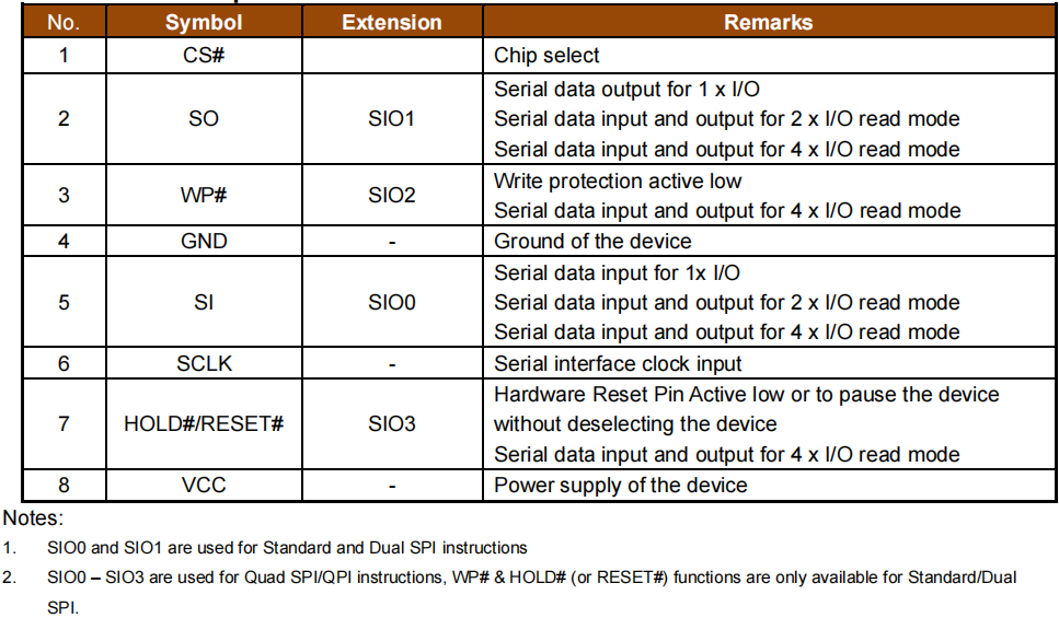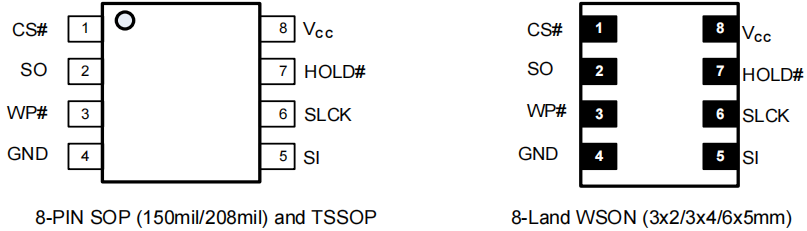 - 标准SPI:SCLK、CS#、SI、SO、WP#、HOLD#