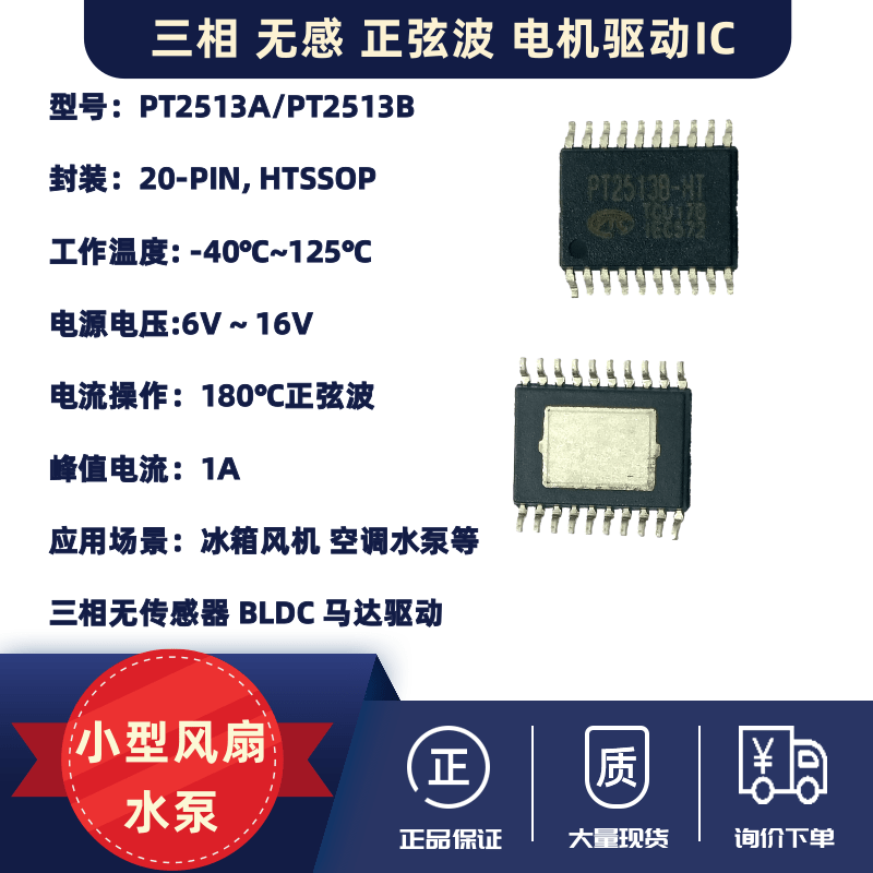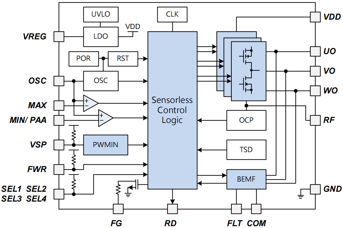 Applications: Three-phase sensorless BLDC motor drive, small fans, water pumps, circulating fans, pedestal fans, bathroom heater fans, fan lights, etc.