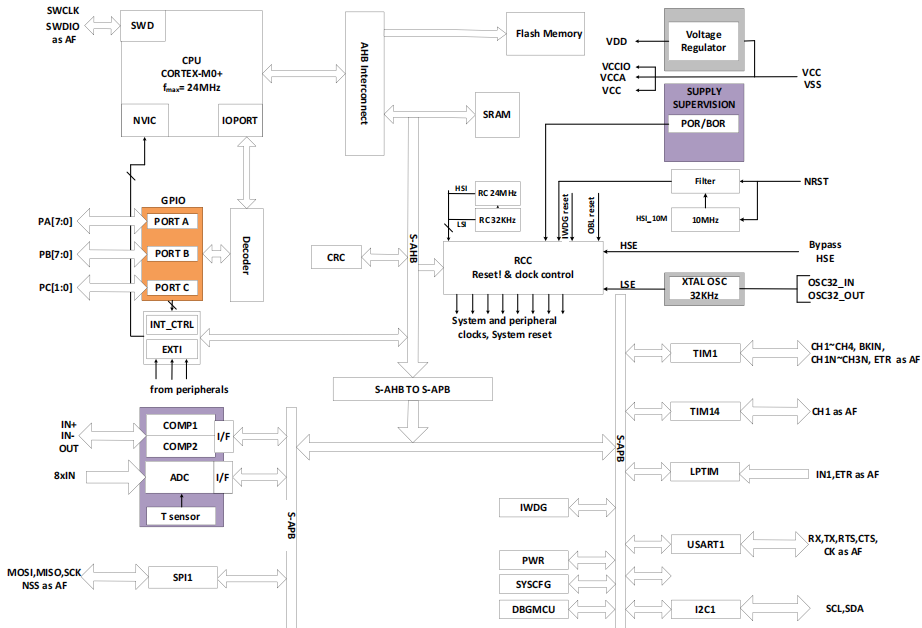 | 内核 — 32 位 ARM® Cortex® - M0+ — 最高 24 MHz 工作频率 存储器 — 24 Kbytes Flash 存储器 — 3 Kbytes SRAM 时钟系统 — 内部 24 MHz RC 振荡器 (HSI) — 内部 32.768 KHz RC 振荡器 (LSI) — 32.768 KHz 低速晶体振荡器 (LSE) — 外部时钟输入 电源管理和复位 — 工作电压:1.7 V ~ 5.5 V — 低功耗模式: Sleep/Stop — 上电/掉电复位 (POR/PDR) — 掉电检测复位 (BOR) 通用输入输出 (I/O) — 多达 18 个 I/O,均可作为外部中断 — 驱动电流 8 mA 1 x 12 位 ADC — 支持最多 8 个外部输入通道,2 个内部通道 — VADC-REF 内部 1.5 V,VCC | 定时器 — 1 个 16 位高级控制定时器 (TIM1) — 1 个通用的 16 位定时器 (TIM14) — 1 个低功耗定时器 (LPTIM),支持从 stop 模 式唤醒 — 1 个独立看门狗定时器 (IWDT) — 1 个 SysTick timer 通讯接口 — 1 个串行外设接口 (SPI) — 1 个通用同步/异步收发器 (USART),支持自 动波特率检测 — 1 个 I 2C 接口,支持标准模式 (100 KHz)、 快 速模式 (400 KHz),支持 7 位寻址模式 硬件 CRC-32 模块 2 路比较器 唯一 UID 串行单线调试 (SWD) 工作温度:-40 ~ 85 °C 封装 TSSOP20, QFN20, SOP16, SOP14 |