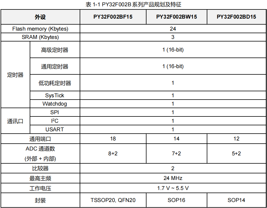 ![]() | 芯片描述: PY32F002B 系列微控制器采用高性能的 32 位 ARM® Cortex®-M0+内核,宽电压工作范围的 MCU。嵌入24 Kbytes Flash 和 3 Kbytes SRAM 存储器,最高工作频率 24 MHz。包含多种不同封装类型产品。芯片集成 I²C、SPI、USART 等通讯外设,1 路 12 位 ADC,2 个 16 位定时器,以及 2 路比较器 PY32F002B 系列微控制器的工作温度范围为-40°C ~ 85°C,工作电压范围 1.7 V ~ 5.5 V。芯片提供sleep/stop 低功耗工作模式,可以满足不同的低功耗应用。 PY32F002B 系列微控制器适用于多种应用场景,例如控制器、手持设备、PC 外设、游戏和 GPS 平台、工业应用等。 ![]() | |