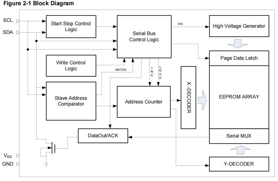 P24C128E是128 Kbit I²C兼容串行EEPROM(电可擦除可编程存储器)设备。它包含一个16384×8位的内存阵列,每页64个字节。
