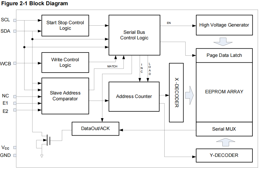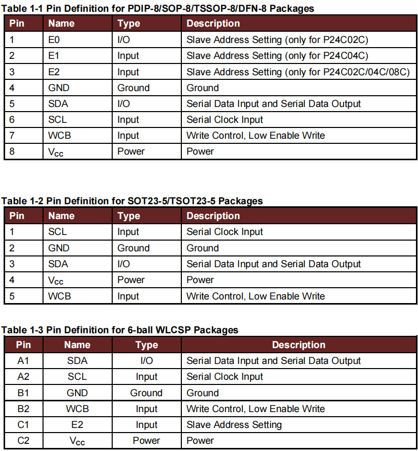 ![]() | 芯片描述: P24C02C/P24C04C/P24C08C/P24C16C是2/4/8/16-Kbit I²C兼容串行电可擦除可编程存储器(EEPROM)器件。 该系列包含256/512/1024/2048×8位的存储阵列,每页容量为16字节。 P24C02C/P24C04C/P24C08C/P24C16C为不同应用场景提供以下器件选择。