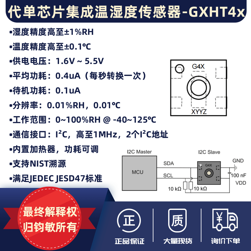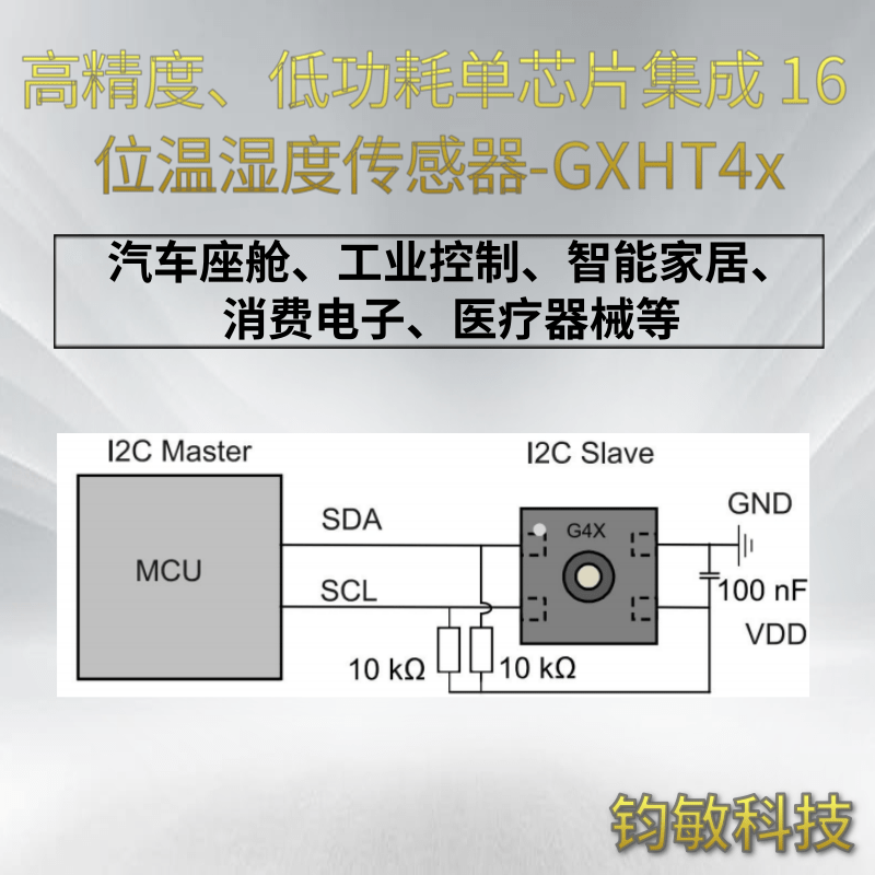 ![]() | 产品概述: GXHT4x是中科银河芯新一代单芯片集成温湿度传感器,可以提供可配置的I²C地址;内置加热器可以在防结露场合开启,加热器功率可配置。 GXHT4x采用4管脚的DFN封装,适用于标准的SMT贴装工艺流程。 应用场景 : 汽车座椅 工业控制 智能家居 消费电子 医疗器械 |