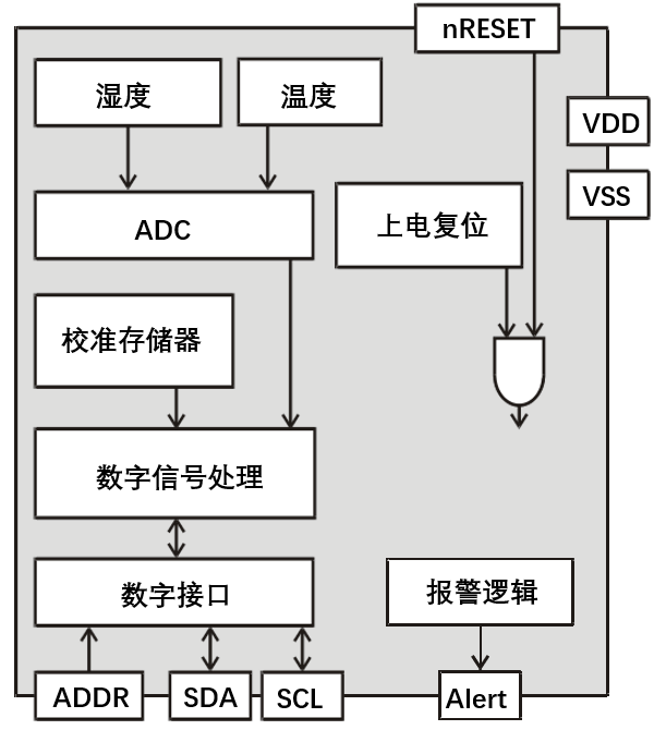 图 2 GXHT30 的功能原理框图。温湿度传感器出厂前已对温度 和供电电压的变化进行补偿校准。 |
