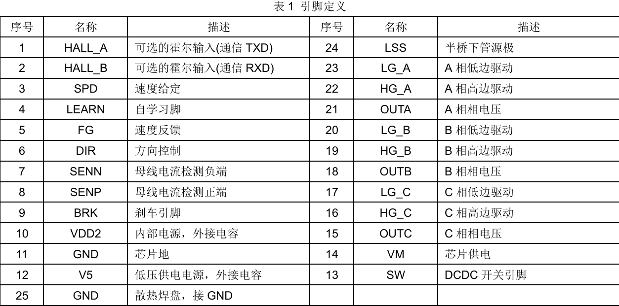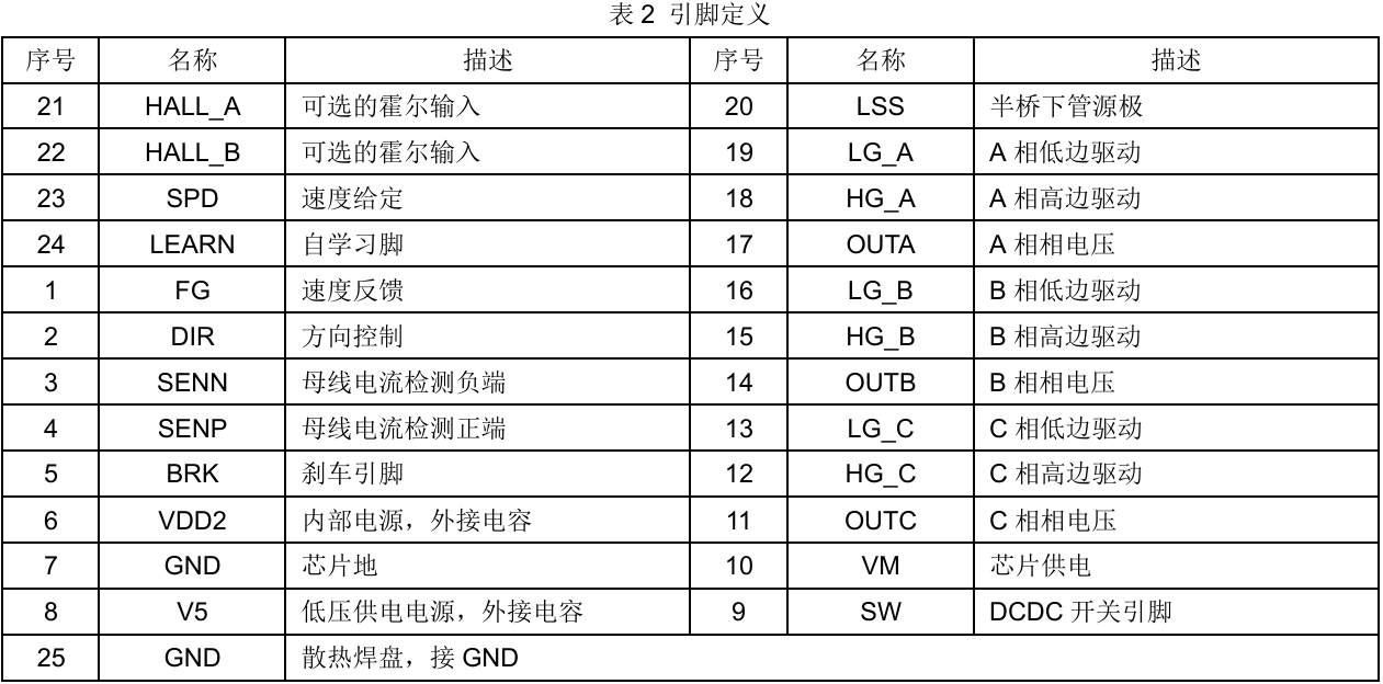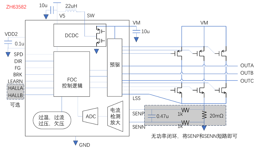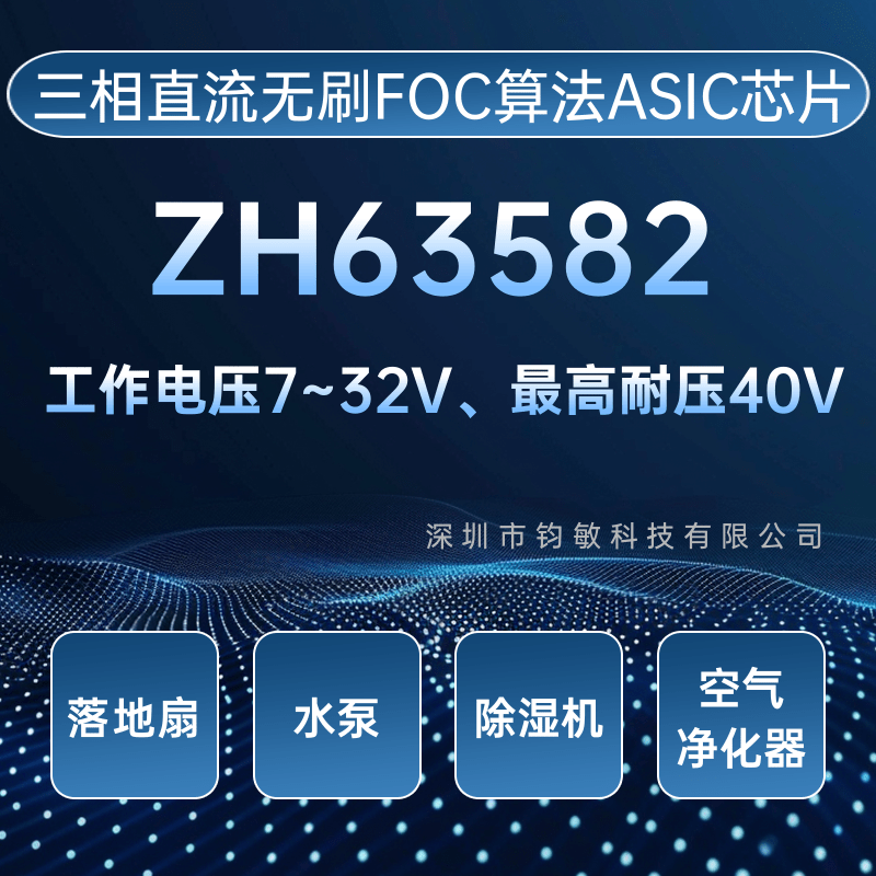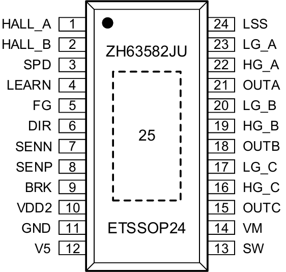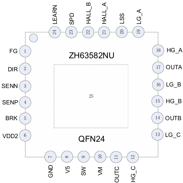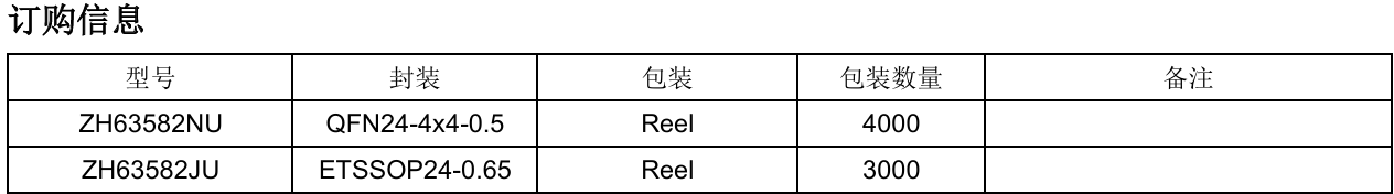 ZH63582 是一款工作电压7V~32V、最高耐压40V的 高集成度三相FOC预驱驱动芯片。集成了FOC控制算法, DCDC或LDO自供电,上管PMOS下管NMOS驱动,以 及检测信号处理电路。 系统通过SPD引脚调节速度,FG引脚反馈速度,DIR 引脚调节方向,BRK引脚控制刹车。并提供过流、短路、过 压、欠压、过温和堵转保护以及限流等功能。 系统的外部电路设计精简,适合风扇和水泵类三相永磁 同步电机的集成控制和驱动。采用 ETSSOP24 和 QFN24 两种封装形式。
