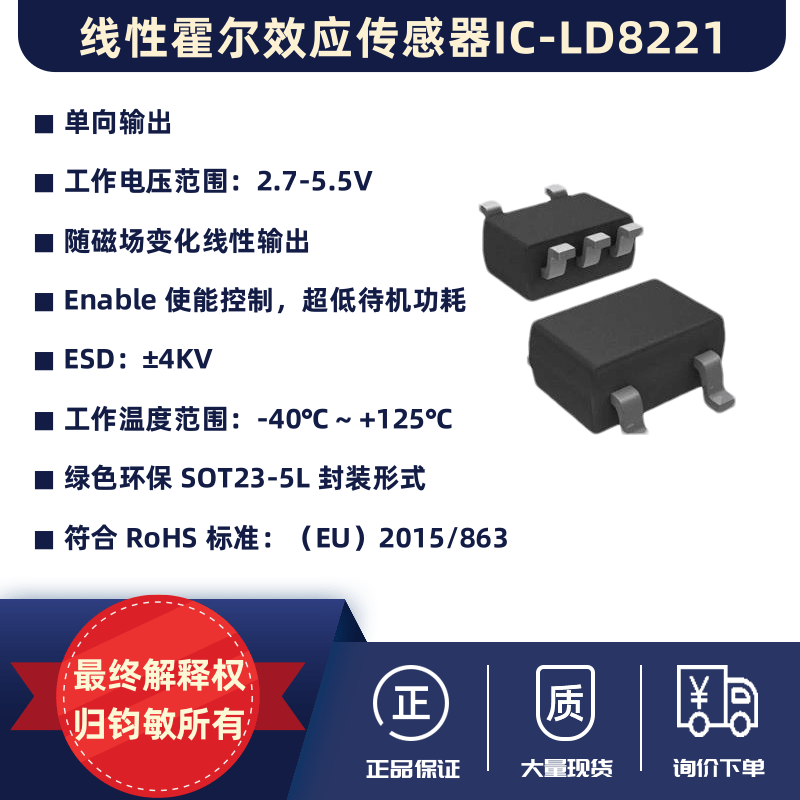 ![]() | 芯片概述: LD8221 是一款线性霍尔效应传感器电路,它的运行依靠永久磁铁或电磁铁的磁场。 输出电压随磁场强度的变化而成比例地变化。 灵敏度与电源电压成正比。该电路具有低噪声输出的特点,可不需采用外部滤波。 LD8221 的零点(无磁场)输出电压默认为 3.0V,3.3V 下灵敏度典型值为 6.0 mV/Gs。 LD8221 的典型工作电压为 3.3V,极限耐压 7V,工作温度范围支持-40~+125℃,适合于各种民用、商业及工业应用领域。 LD8221 提供 SOT23-5L 封装形式,亚光镀锡,采用无卤绿料,满足环保要求。 芯片应用 ◼ 电流传感 ◼ 电机控制 ◼ 位置传感 ◼ 三模可调行程磁轴键盘 |