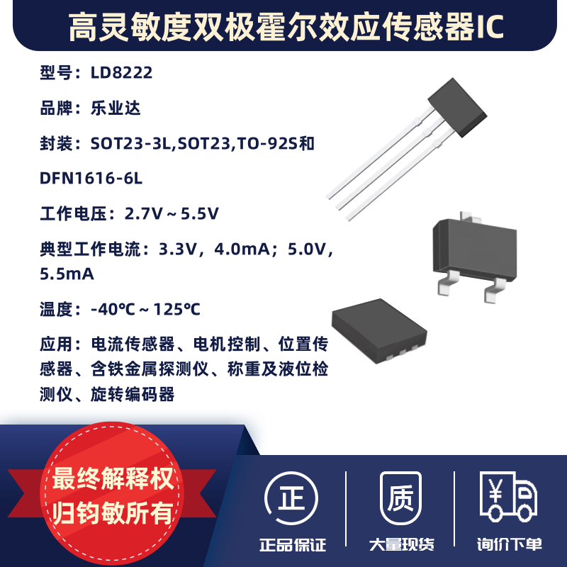 ![]() | 芯片概述: LD8222 是一款高性能轨对轨输出的线性霍尔效应传感器,专为精确测量磁场强度或位置变化而设计。其输出电压与施加的磁场成线性比例关系,具备卓越的温度稳定性和批次一致性,适用于工业控制、消费电子,低电压供电和高精度应用场景。 LD8222 的零点(无磁场)输出电压默认为输入电源的 1/2,3.3V 下灵敏度典型值为 1.5mV/Gs,5.0V下灵敏度典型值为 2.5mV/Gs。 LD8222 的典型工作电压为 3.3V 和 5.0V,极限耐压 7V,工作温度范围支持-40~125℃。 LD8222 提 供 SOT23-3L,SOT23,TO-92S 和DFN1616-6L 封装形式,亚光镀锡,采用无卤绿料,满足环保要求。 芯片应用: 电流传感器 电机控制 位置传感器 含铁金属探测仪 称重及液位检测仪 旋转编码器 |