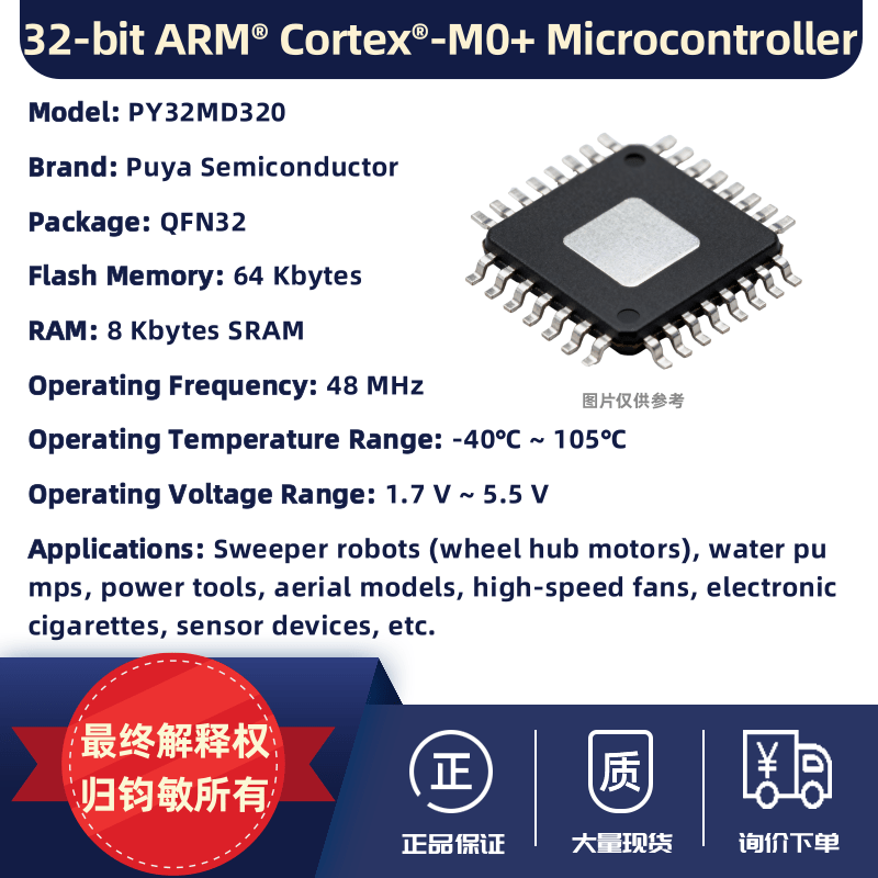 ![]() | Chip IntroductionThe PY32MD320 series microcontrollers are equipped with a high-performance 32-bit ARM® Cortex®-M0+ core and feature a wide voltage operating range. They embed up to 64 Kbytes of flash memory and 8 Kbytes of SRAM, with a maximum operating frequency of 48 MHz. The product series includes multiple models with different package types. The chip integrates a variety of communication peripherals such as multiple I2C, SPI, and USART interfaces, 1 channel of 12-bit ADC (Analog-to-Digital Converter), 5 units of 16-bit timers, and 2 comparators. The PY32MD320 series microcontrollers have an operating temperature range of -40℃ ~ 105℃ and an operating voltage range of 1.7 V ~ 5.5 V. They offer low-power operating modes including sleep and stop, which can meet the requirements of various low-power applications. |