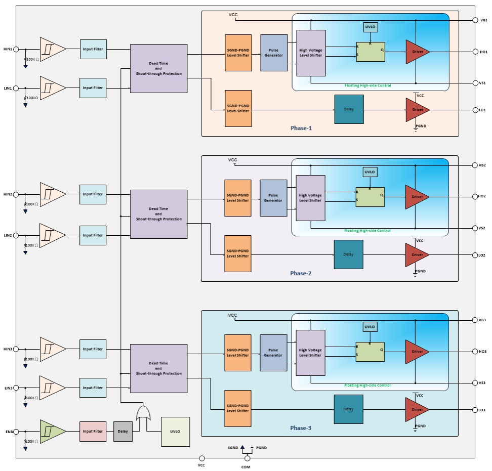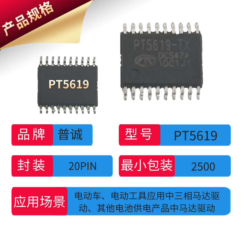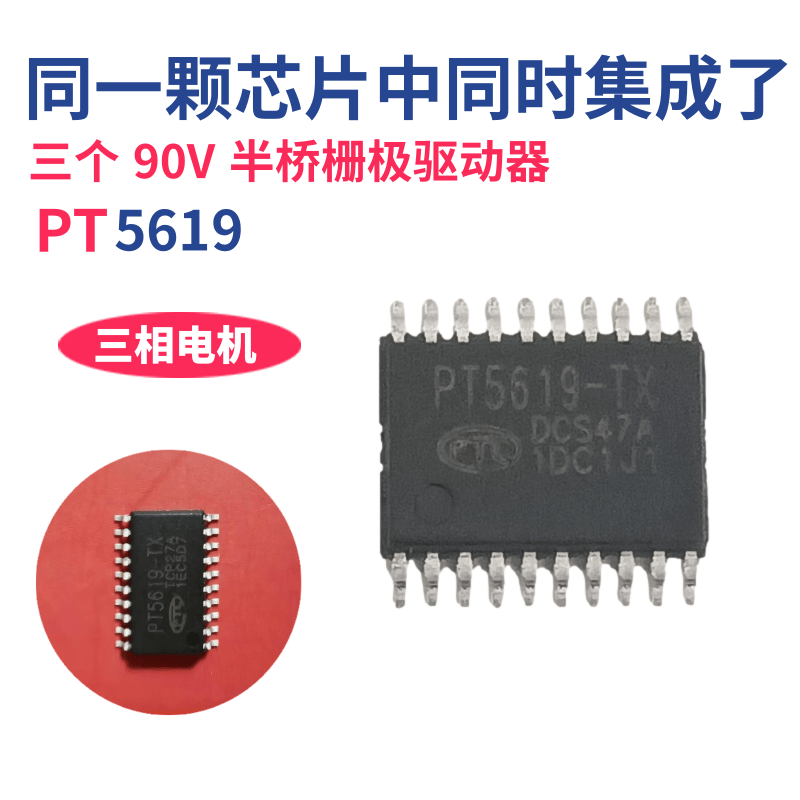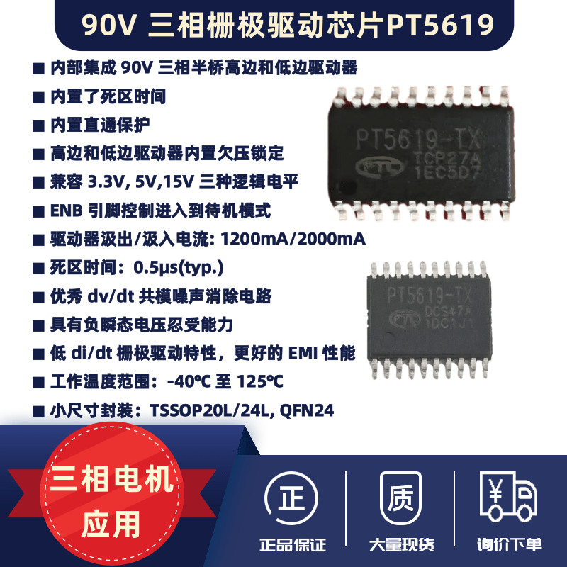 ![]() | Chip Overview : PT5619 integrates three 90V half-bridge gate drivers in a single chip, making it particularly suitable for driving high-speed power MOSFETs and IGBTs in three-phase motor applications. The chip features built-in dead-time control and cross-conduction protection for upper and lower switches, effectively preventing damage to half-bridge circuits. To avoid power device damage caused by the chip operating at low supply voltages, an internal undervoltage lockout (UVLO) circuit is integrated to prevent such issues. Advanced high-voltage BCD process and built-in common-mode noise cancellation technology enable the high-side driver to operate stably in high dv/dt noise environments, while also providing the chip with a wide range of negative transient voltage tolerance. For extended battery life, the chip can enter a low-current standby mode via control of the ENB pin. |