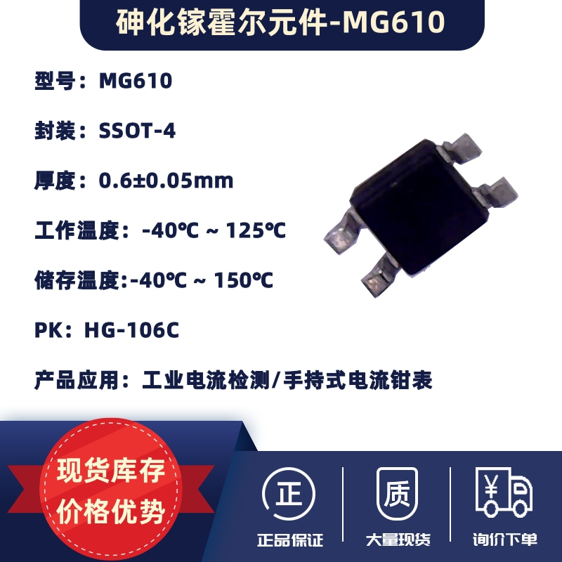 ![]() | Brief Introduction to MG610: MG610 is a gallium arsenide (GaAs) Hall element with high sensitivity and excellent temperature stability, making it ideal for industrial sensing applications. As a linear GaAs Hall element featuring superior thermal characteristics, the MG610 comes in an ultra-thin SSOT-4 package with a device thickness of 0.6±0.05mm. It is widely suitable for the assembly design of current clamp meters and is shipped in tape-and-reel packaging (4000pcs per reel). It is a pin-to-pin alternative to the comparable product HG-106C. Both the MG610 and HG-106C deliver high sensitivity at room temperature, and the MG610 boasts excellent distribution consistency, enabling direct drop-in replacement. (For detailed specifications, please refer to the datasheet.) |
